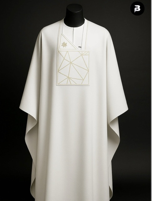 This design features a bold, architectural chest panel with layered geometric embroidery, meticulously constructed to create depth and dimension. The textured detailing adds a regal edge while maintaining the purity of the all-white palette. A timeless ceremonial piece designed for grooms, dignitaries, and men who command attention without excess.